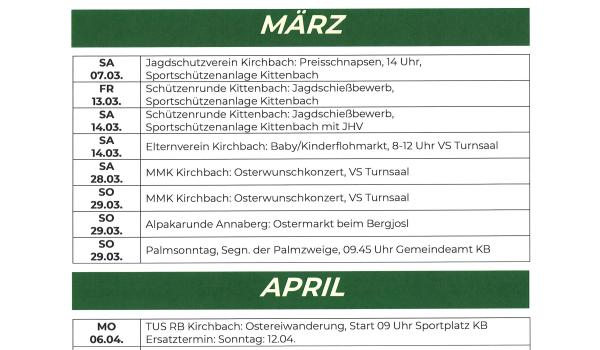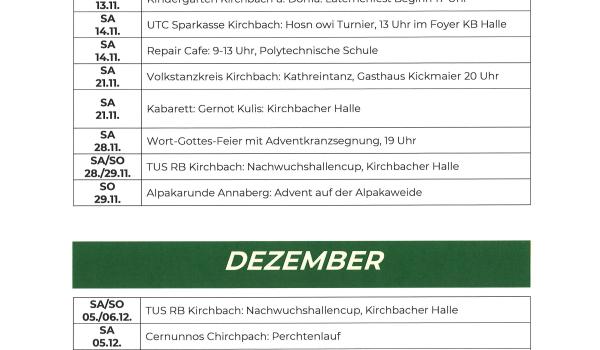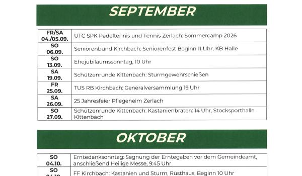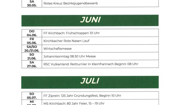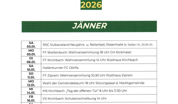 Terminkalender der Marktgemeinde Kirchbach-Zerlach 2026